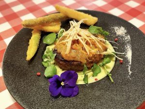 割ると肉汁とともにとろりと溢れるゴーダチーズを包んだハンバーグ。